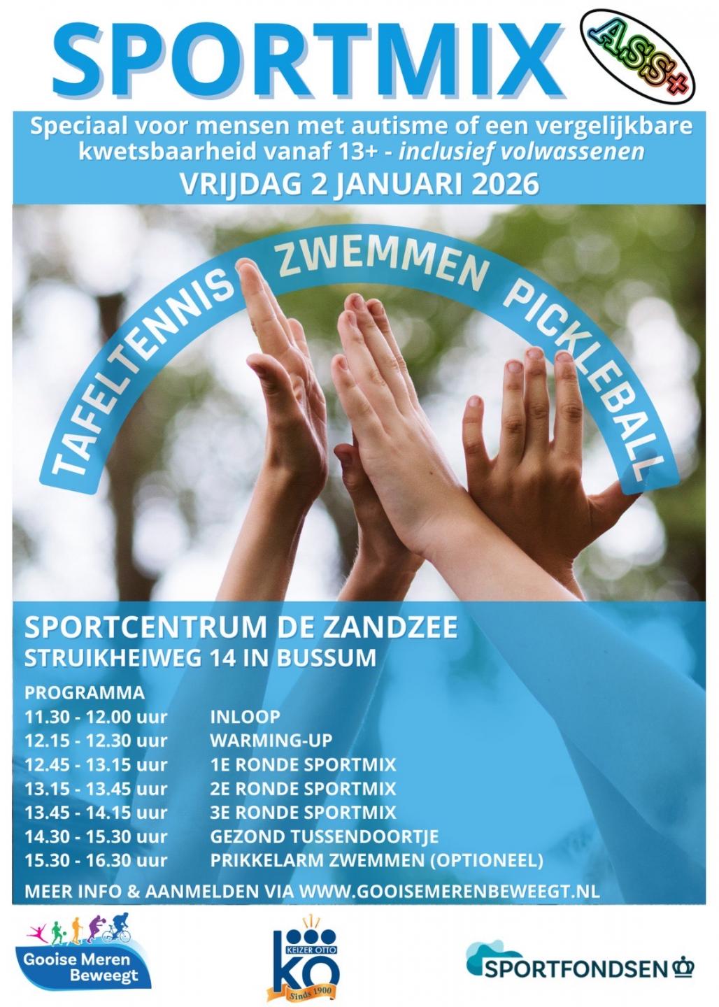 Voor mensen met autisme of een vergelijkbare kwetsbaarheid is sporten niet altijd vanzelfsprekend, terwijl bewegen juist zo belangrijk is. Gooise Meren Beweegt maakt het toegankelijker met een speciale Sportmix in Sportcentrum De Zandzee.